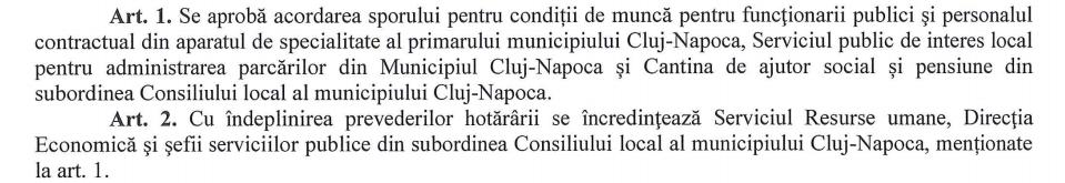 Consilierii locali au votat proiectul , în unanimitate (18 voturi pentru), în şedinţa extraordinară de miercuri, 7 august 2019. Conform hotărârii de Consiliul Local, de mărirea salarială vor beneficia funcţionarii publici şi personalul contractual din aparatul de specialitate al primarului municipiului Cluj-Napoca, Serviciul public de interes local pentru administrarea parcărilor din Municipiul Cluj-Napoca şi Cantina de ajutor social şi pensiune din subordinea Consiliului local al municipiului Cluj-Napoca.