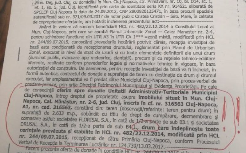 - Extras foto din oferta de donație drum, semnată de firma dumneavoastră, prin care dumneavoastră, fără bani, donați acest teren orașului", a transmis municipalitatea clujeană.