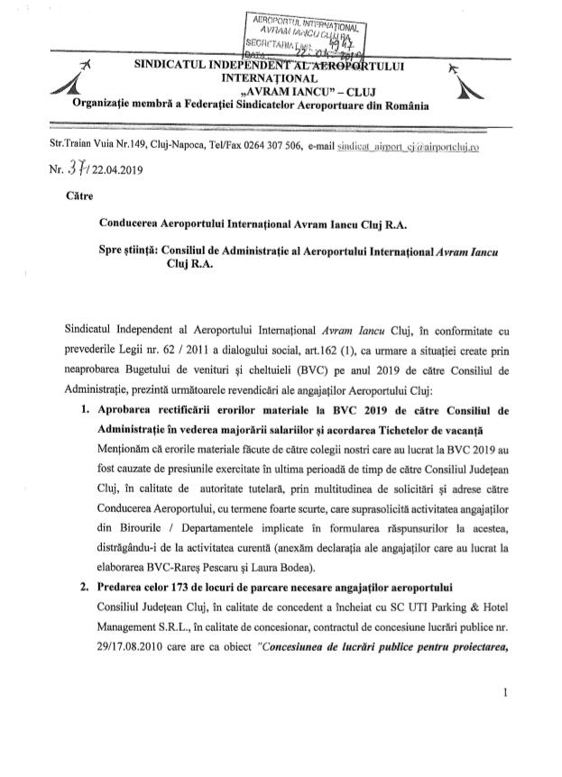 Sindicatul Independent al Aeroportului Internațional Avram Iancu Cluj a transmis o serie de revendicări, atât Conducerii Aeroportului cât și Consiliului de Administrație al Aeroportului, la care Consiliului de Administrație nu a răspuns.