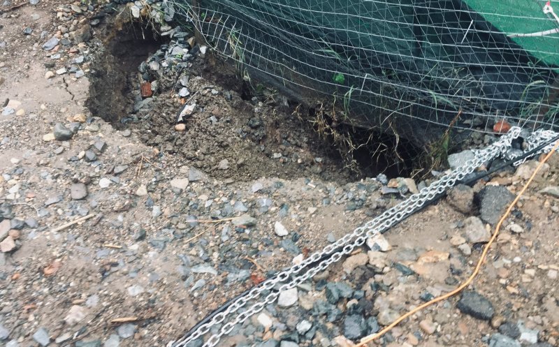 „Strada Papilian dispare în craterul de pe șantier! Rugăm autoritățile să intervină de urgență! Încă două bucăți din strada Victor Papilian s-au surpat în noaptea aceasta și surpările continuă să se extindă spre casele oamenilor! Vedeți aici live șantierul și cum pământul surpat de pe stradă iese pe sub stâlpii proptiți să susțină un deal!”, se arată în postare.