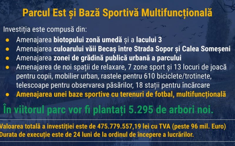 Această investiție presupune amenajarea de noi spații de relaxare, 7 zone sport și 13 locuri de joacă pentru copii, amplasarea de mobilier urban, rastele pentru 610 biciclete/trotinete, telescoape pentru observarea păsărilor, 18 stații pentru încărcarea mașinilor electrice.