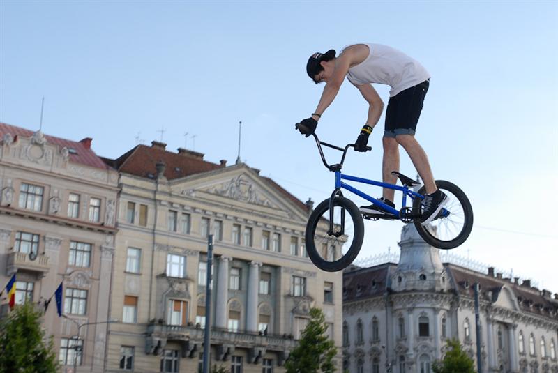 Patru tineri din Ungaria şi un clujean au susţinut o demonstraţie de acrobaţii ciclistice de efect în Piaţa Unirii, în vecinătatea statuii lui Matei Corvin.