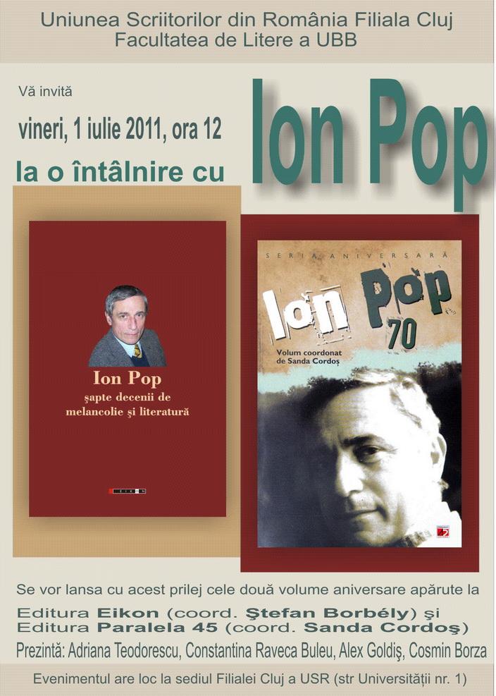 Două volume aniversare, apărute la editurile Eikon şi Paralela 45, la aniversarea de 70 de ani ai scriitorului Ion Pop, vor fi lansate în 1 iulie la filiala din Cluj a Uniunii Scriitorilor din România (USR).