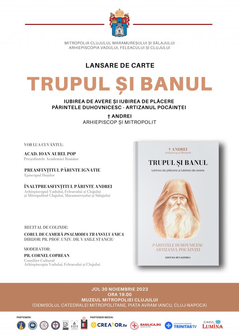 Cu acest prilej va fi prezentat volumul semnat de către Înaltpreasfințitul Părinte Arhiepiscop și Mitropolit Andrei, "Trupul și banul: iubirea de plăcere și iubirea de avere. Părintele duhovnicesc – artizanul pocăinței", apărut anul acesta la Editura Renașterea. În cadrul evenimentului editorial vor lua cuvântul acad. Ioan Aurel Pop, Președintele Academiei Române, Preasfințitul Părinte Ignatie, Episcopul Hușilor, și autorul volumului.
