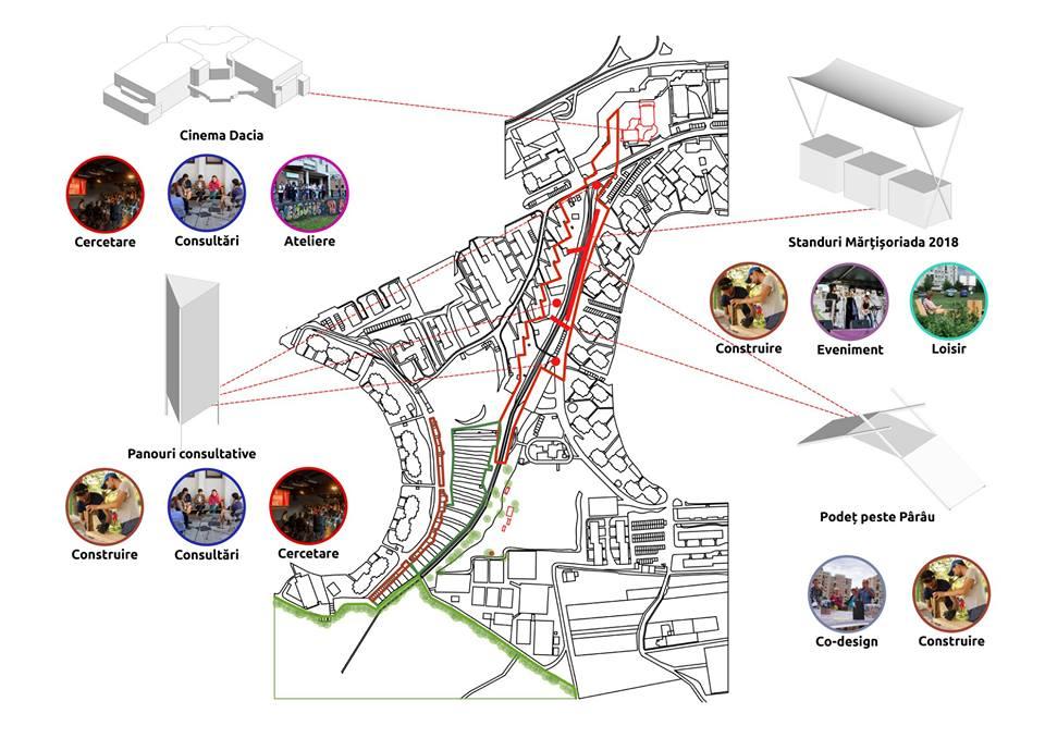 Inițiativa noastră a activat aleea care bordează pârâul printr-o expoziție de fotografie în aer liber (2016), diverse ateliere (grafitti, reciclare, dezbateri), iar în 2017 am construit patru module de mobilier urban pe roți, care folosesc acest traseu pentru a lega fizic zona verde La Terenuri de Cinema Dacia. Așadar, această ocazie de a pune în evidență zona pârâului, vine pe un fond necesar, după cinci ani de implicare în cartier.