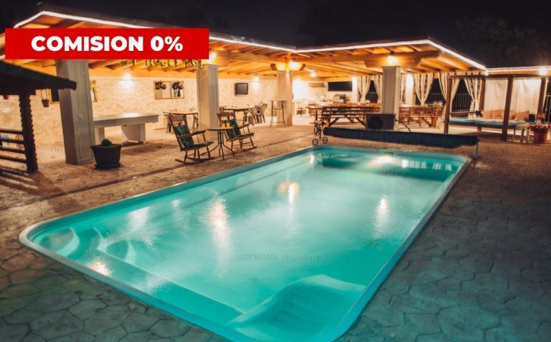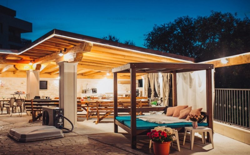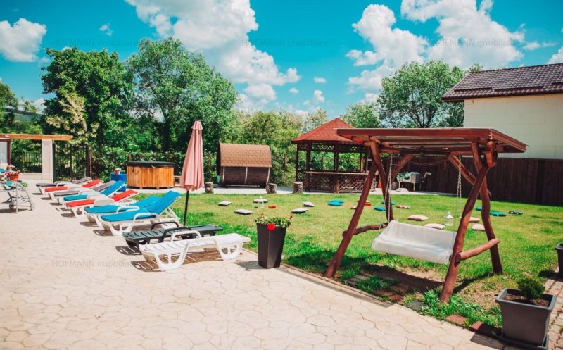 Curtea amenajata dispune de piscina, barbeque, sauna, jacuzzi, foisor, loc acoperit pentru luat masa sau gatit, totul acompaniat de sunetul placut al paraului care se afla langa proprietate'', se arata in anuntul imobiliar.