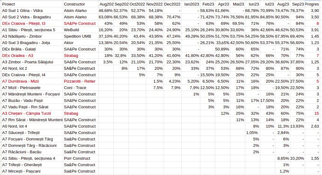 Progresul lucrărilor pe segmentele de autostrăzi din țară diferă de la un șantier la altul. În luna septembrie, cel mai mare avans s-a înregistrat pe un lot care aparține și de Cluj.