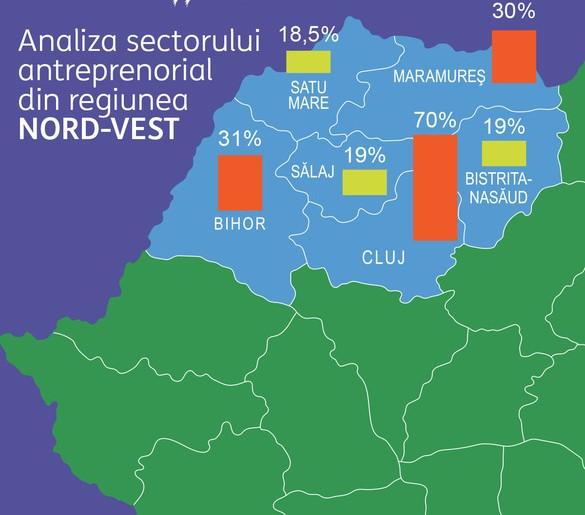 În județul Cluj se regăsesc cele mai multe companii antreprenoriale cu cifra de afaceri peste 10 milioane de euro, mai exact 110, dar și cele mai multe firme care au activități de export, respectiv 145. Totodată, județul Cluj a înregistrat cea mai mare creștere a cifrei de afaceri totale în anul 2022 comparativ cu anul 2021, de 70%.