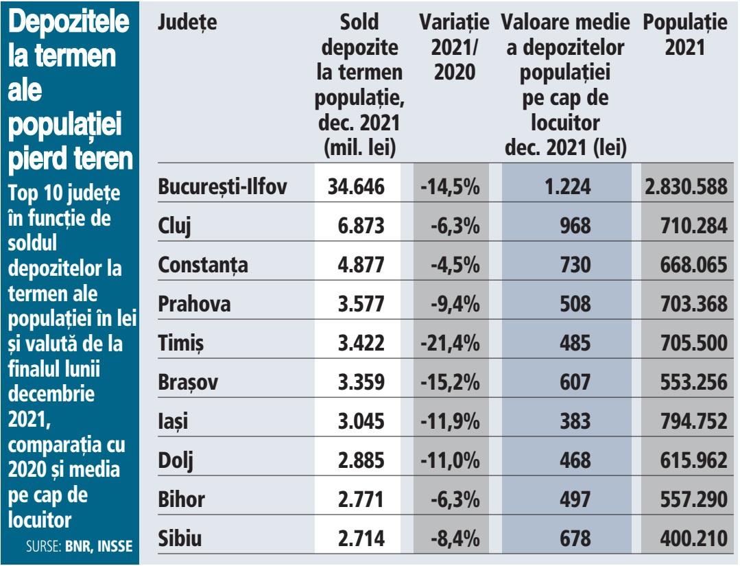 Valoarea medie a depozitelor la termen ale populaţiei pe locuitor, în lei şi valută, la final de 2021 din cele 10 judeţe din clasament este cuprinsă între 383 lei şi 1.224 lei.
