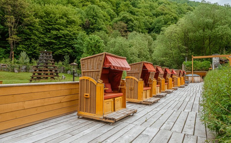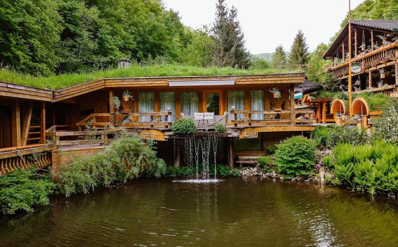 "O pensiune toată bătută în piatră, lemn și flori roșii își întâmpină oaspeții cu camere moderne și terase boeme pentru cafele și pierdut privirea-n verde. Totul e din lemn, interior și exterior. Arhitectura se încadrează în stilul rustic local, dar interiorul camerelor îmbrăcate în lemn are atmosfera de cabană contemporană. Sunt 10 camere cu balcoane deasupra lacului, alte 7 camere în corpul principal (două dintre ele au terasă proprie și ciubăr privat cu aeromasaj) și 4 apartamente (unul cu suprafață de 48mp, duș și cadă cu hidromasaj; terasa acestuia este deasupra cascadei; alte două apartamente au ciubăr privat).