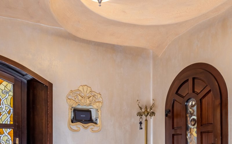 Imobilul are 3 intrări, 2 in față și una în spatele casei. Ușa de la intrare, la fel ca tâmplăria din întreaga locuință, este din lemn Larice siberian și vitralii. Vitraliile care se regăsesc in întreaga locuință sunt realizate manual în tehnica Tiffany. În holul de la intrare ne întâmpină tavanul in forma de vortex. La etajul 1 se află 2 dormitoare, 2 băi și un dressing. 4 uși cu vitralii tematice -fiecare încăpere reprezinta un anotimp. În hol se găsește un copac stilizat care ține si loc de balustradă format din 70.000 bucăți de mozaic Bisazza tăiate, lipite si potrivite manual, cu frunzele căzute în pardoseala de marmură.