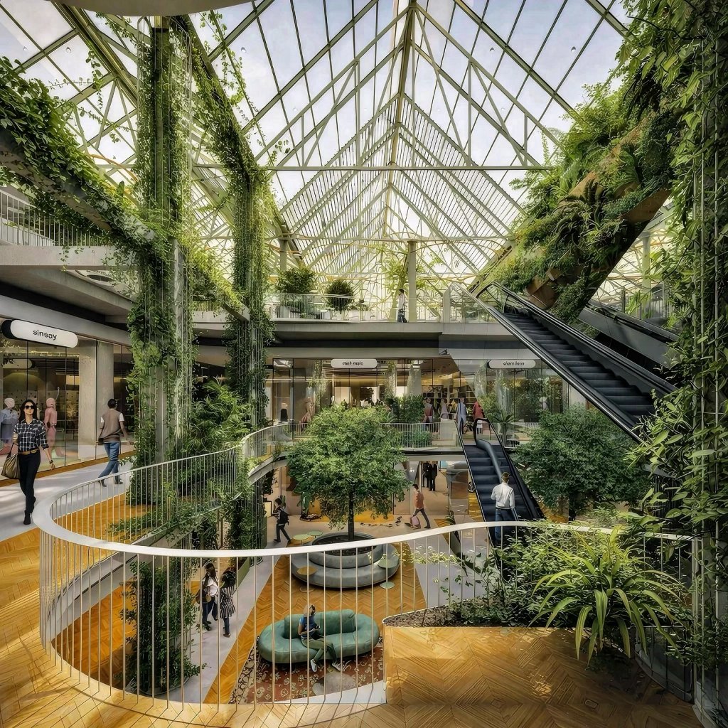"Lumina naturală, vegetația reală și relațiile vizuale dintre niveluri construiesc orientare și confort, reducând stresul specific spațiilor comerciale închise.