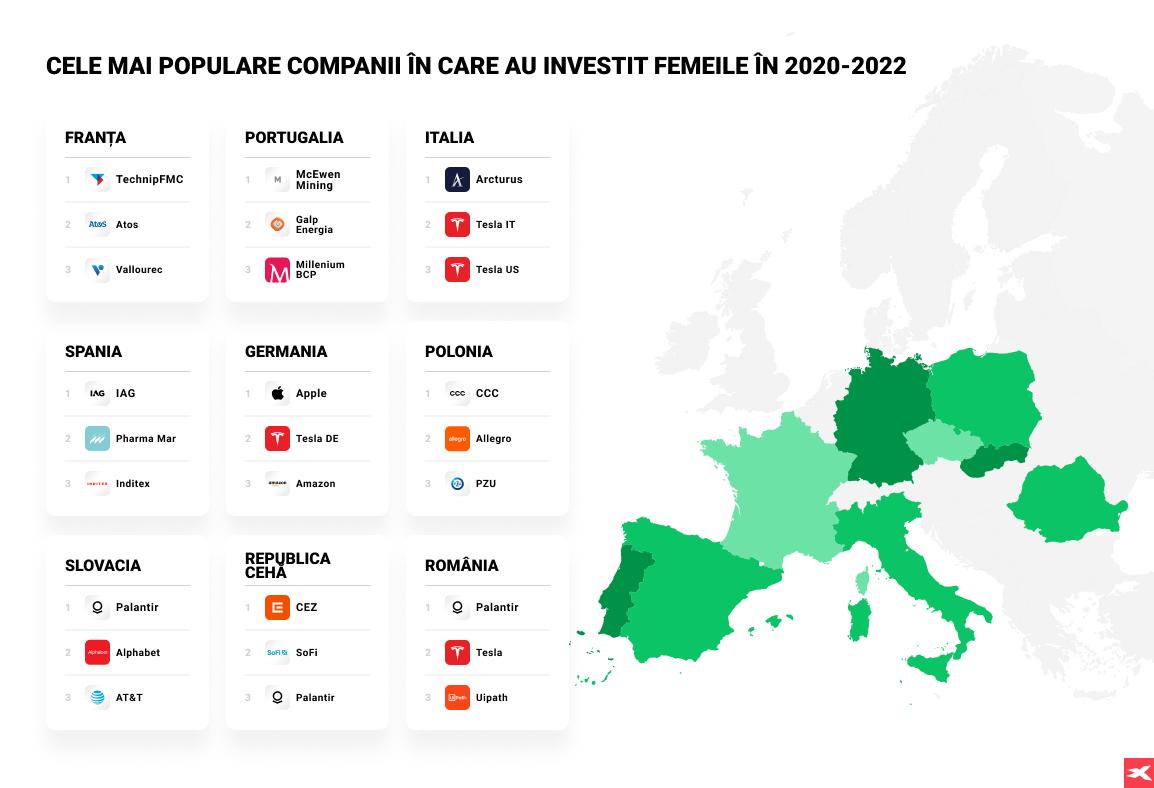 Cel mai mic procent de femei în rândul investitorilor este în Republica Cehă, Franța și Germania. Acestea sunt singurele piețe în care acest procent este, în prezent, sub 10%. De asemenea, în contextul unei volatilități majore pe burse, ponderea femeilor în rândul clienților noi a atins, în 2022, un nivel record, de 16%.