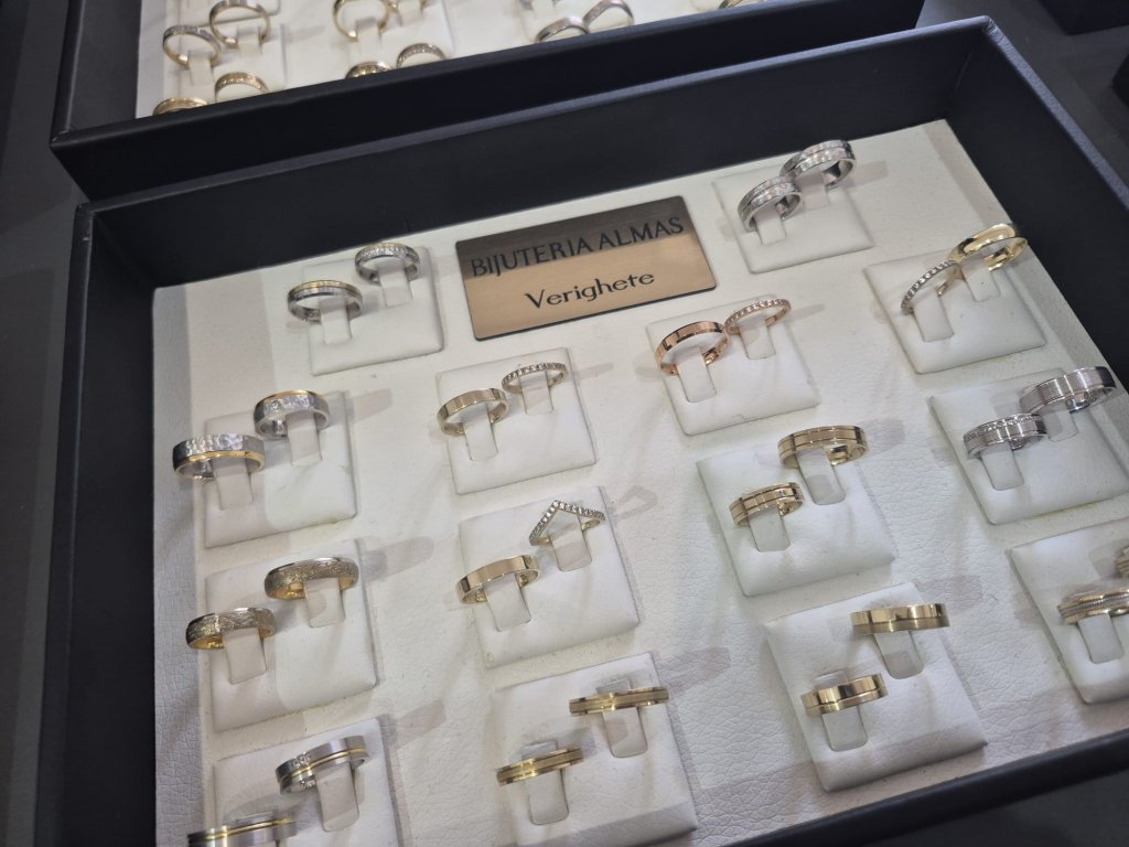 Bijuteriile continuă să fie un detaliu important pentru personalizarea nunții. În ultima vreme, verighetele „infinity” cu pietre se vând foarte bine. Bărbații preferă modelele clasice, iar femeile optează pentru ceva mai extravagant. Prețurile variază între 6.000 și 7.000 lei, au explicat reprezentanții de la Bijuteria Almas.