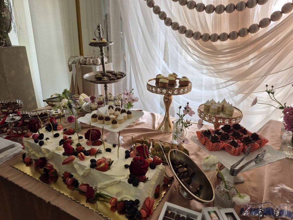 În materie de dulciuri, candy bar-urile rămân în trend. Prăjiturelele în formă de fructe și combinațiile de pachete cu fructe sunt preferate, iar prețurile pornesc de la 25 lei/persoană pentru candy bar și 15 lei/persoană pentru felii de tort, au spus cei de la Cakes by Lavi.