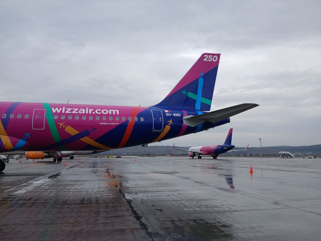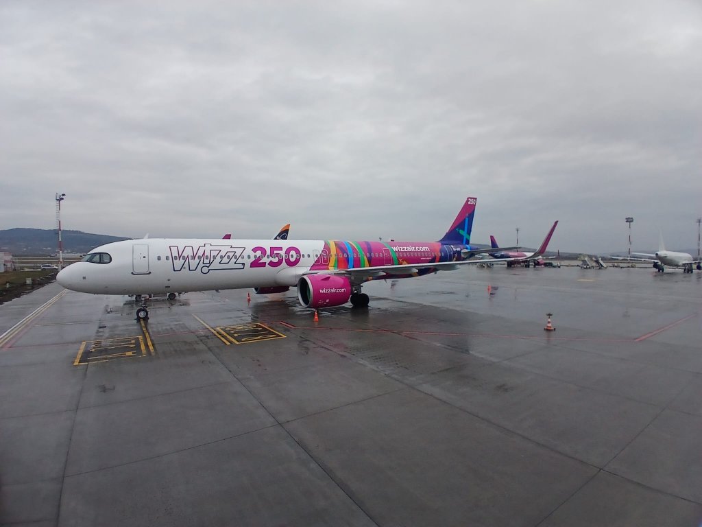 Aeronava cu numărul 250 din flota Wizz Air, vopsită într-un livery special aniversar, a aterizat la Cluj-Napoca, marcând un moment important pentru companie și pentru pasionații de aviație.