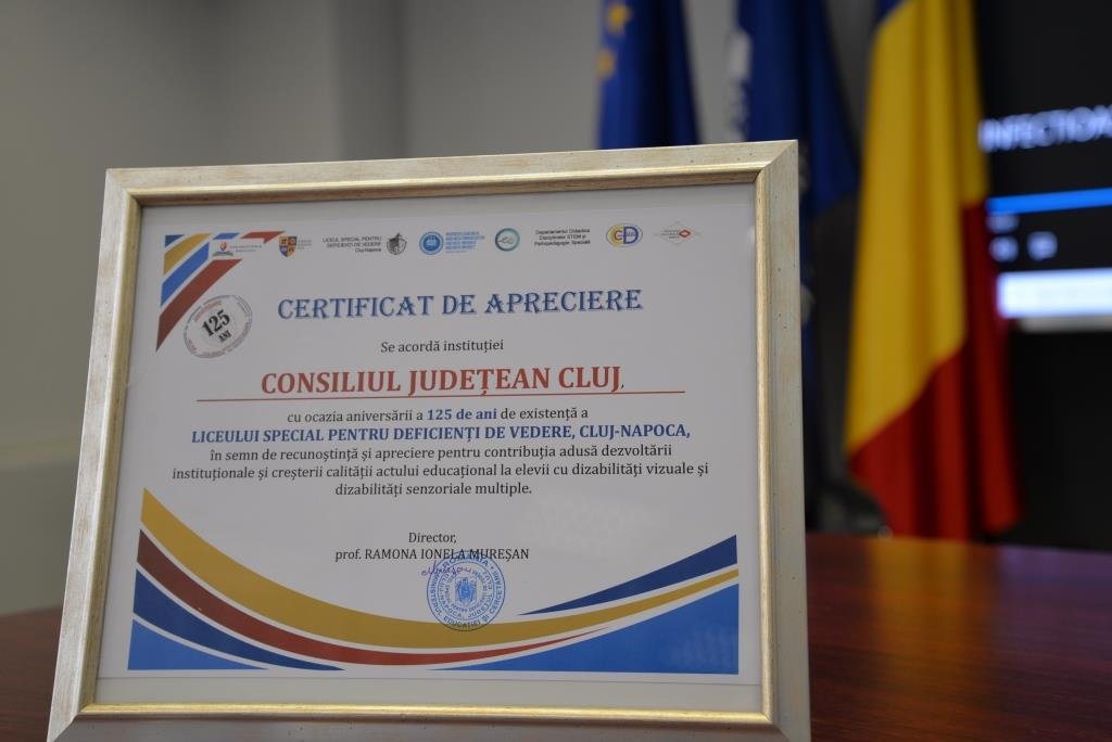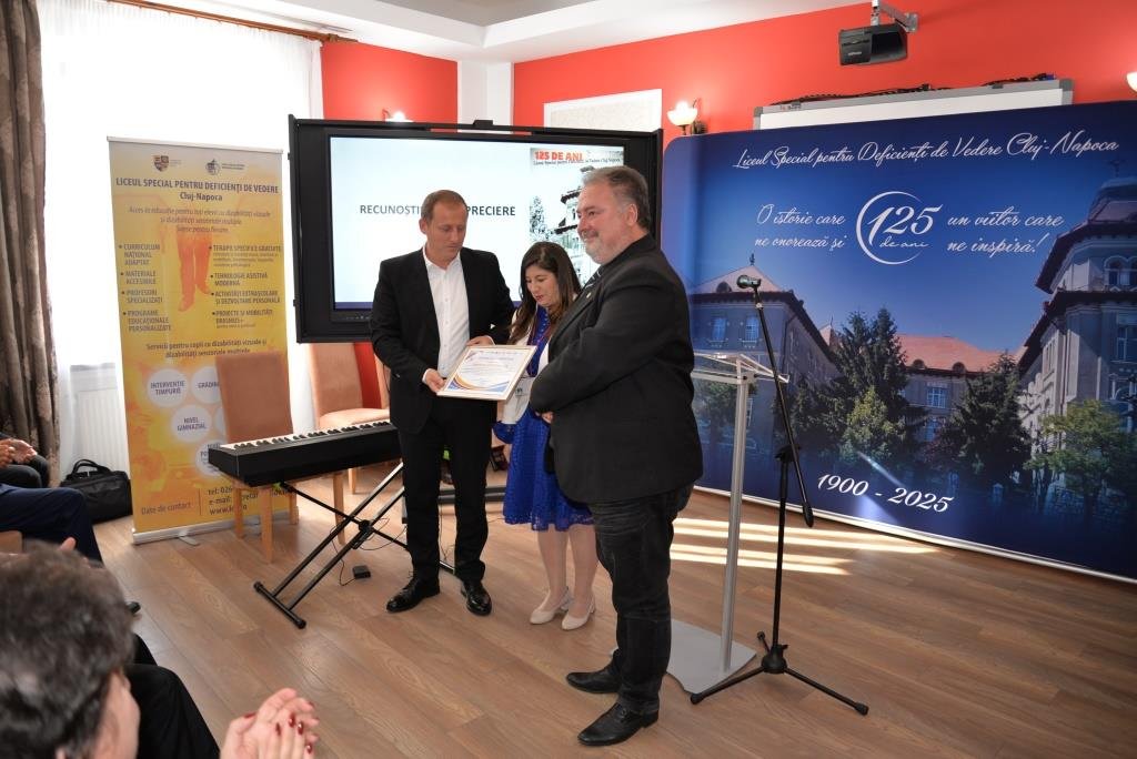 Vicepreședinții Consiliului Județean Cluj, Radu Rațiu și Vákár István, au participat miercuri, 15 octombrie, la evenimentul prilejuit de aniversarea a 125 de ani de existență a Liceului Special pentru Deficienți de Vedere Cluj-Napoca, unitate educațională aflată în subordinea forului administrativ județean.