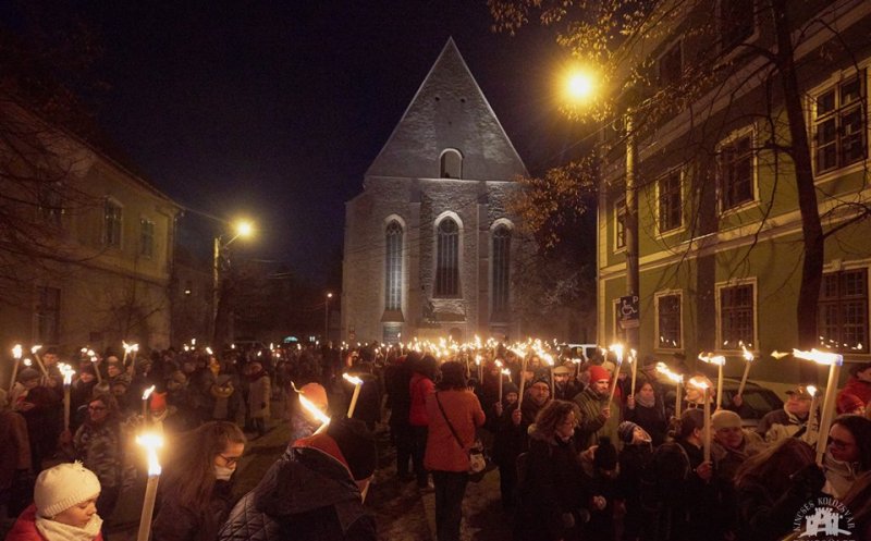 Sute de persoane cu torţe aprinse în mâini şi având în frunte bărbaţi îmbrăcaţi în ţinute medievale din secolul XV au participat, sâmbătă seara, la un marş solemn pentru aniversarea a 576 de ani de la naşterea regelui Ungariei, Matia Corvin, născut la Cluj-Napoca.