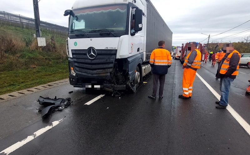 Din primele date, în accident sunt implicate un autocamion și două autoturisme, iar o persoană necesită îngrijiri medicale.
