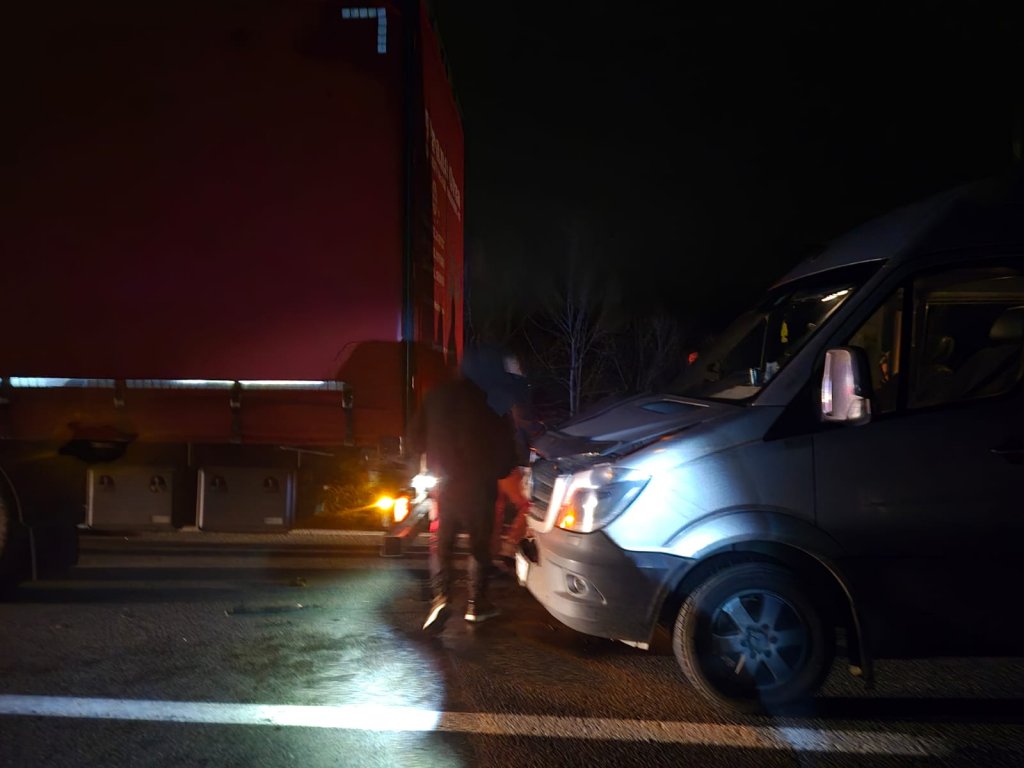Șoferul autocamionului și cele nouă persoane aflate în microbuz în momentul producerii accidentului au fost evaluate medical, însă, potrivit primelor informații, nu au suferit leziuni și nu au necesitat transportul la spital.