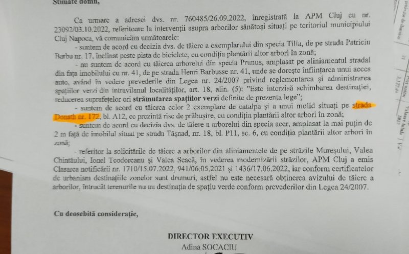 Când i-am luat la întrebări ”de sănătate”, mi-au arătat o adresă de la Agenția pentru Protecția Mediului (APM) Cluj-Napoca, în care zic că două exemplare de catalpa și un molid ar putea fi tăiați, pentru că ar prezenta ”pericol de prăbușire”!!! Cât de ”periculos” e molidul, puteți vedea și voi în imaginile și filmările pe care le-am făcut (în articol).