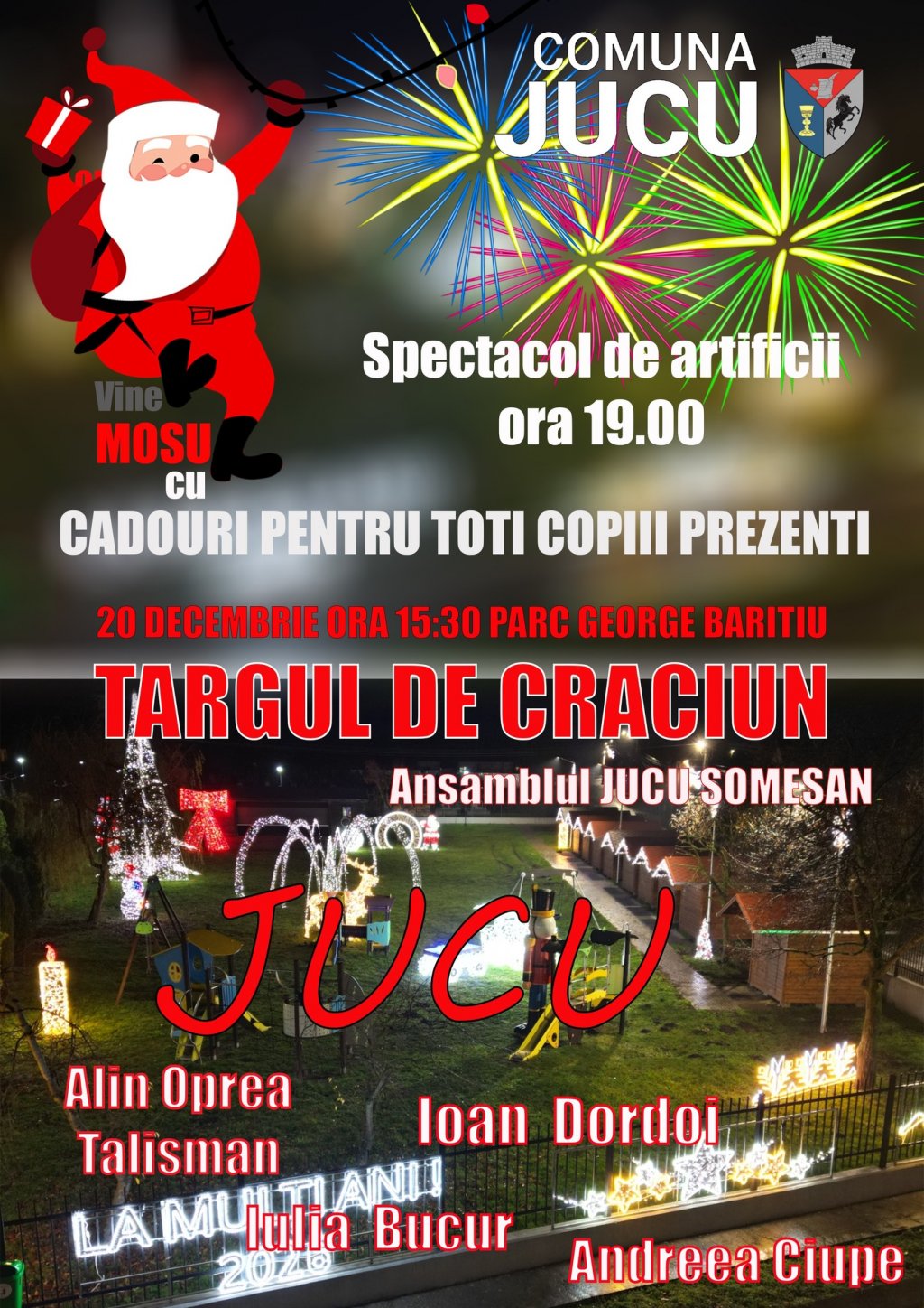 “Sâmbătă, 20 decembrie, începând cu ora 15.30 Primaria Jucu aduce  în parcul George Barițiu din Jucu de Sus, atmosfera de sărbătoare în inimile tuturor prin lumini care se aprind seară de seară,artificii, muzica,dansurile și colinzile  artiștilor nostri iubiți intr-o atmosferă de sărbătoare având casuțele din parc pline de produse locale de sezon în așteptarea lui Moș Craciun care va împărți cadouri”, transmit reprezentanții Primăriei Jucu.