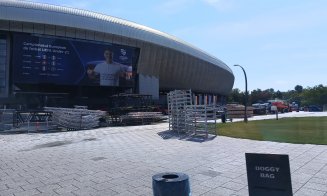Încă de sâmbăta trecută, în fața stadionului Cluj Arena erau parcate deja o parte dintre uneltele de care organizatorii au nevoie pentru a acoperi gazonul sau pentru a forma schelele pentru alpiniștii care vor lucra apoi la montarea scenelor principale.