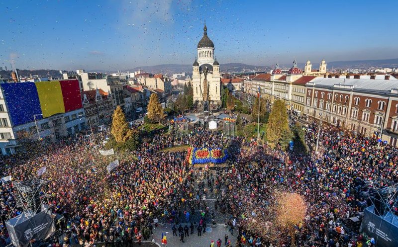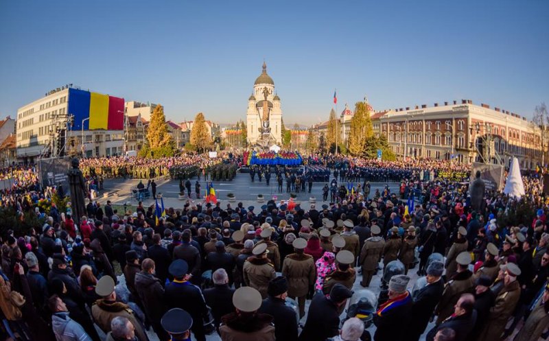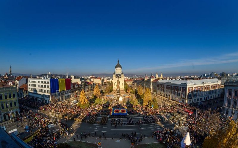 Manifestările dedicate Zilei Naţionale a României au început cu depunerea de coroane de flori la statuia lui Mihai Viteazu, în premieră în Cluj-Napoca şi au continuat cu padara militară în Piaţa Avram Iancu. La intonarea Imnului Naţional, alpiniştii militari au desfăşurat un tricolor uriaş pe clădirea Cercului Militar.
