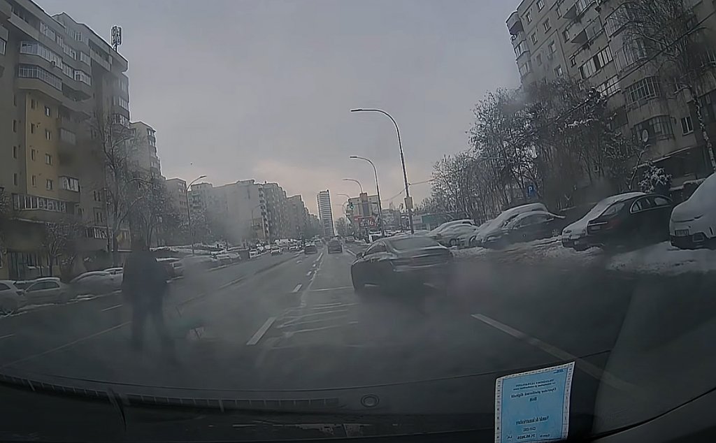 Omul a și salutat după ce șoferul i-a cruțat viața pietonului angajat în traversare. I-a dat prioritate, iar acesta și-a continuat traversarea pe benzile de pe sensul opus de unde veneau mașinile de la semaforul de la intersecția cu Taberei.