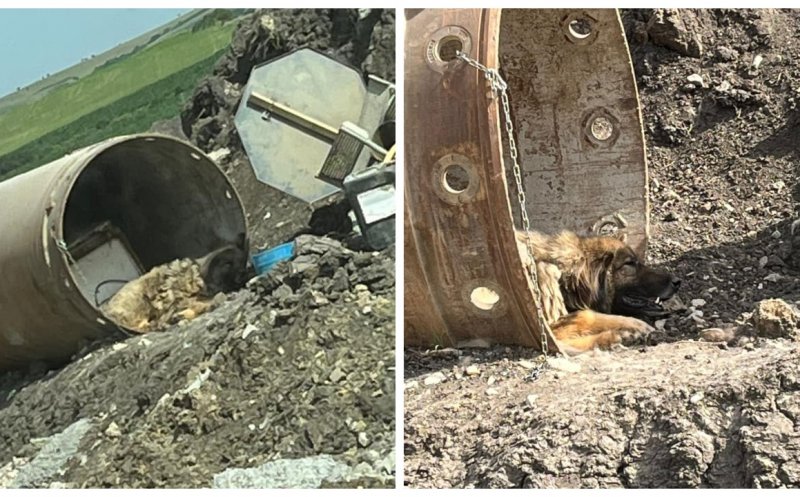 Cruzime pe șantierul de pe A3, în Tureni. Câine legat de un cilindru metalic și lăsat fără apă în caniculă