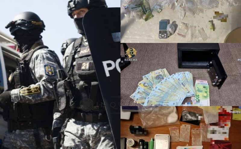 "În urma perchezițiilor domiciliare, au fost descoperite și ridicate aproximativ 2 kilograme de substanțe de tip cristal, din categoria drogurilor de mare risc și a celor cu efect psihoactiv (3-CMC și 2MMC), 57.000 de lei, 5.600 de euro, un pistol cu gaz, o macetă, 1 pistol cu bile, 32 de telefoane mobile, precum și alte mijloace de probă", a informat Poliția Română.