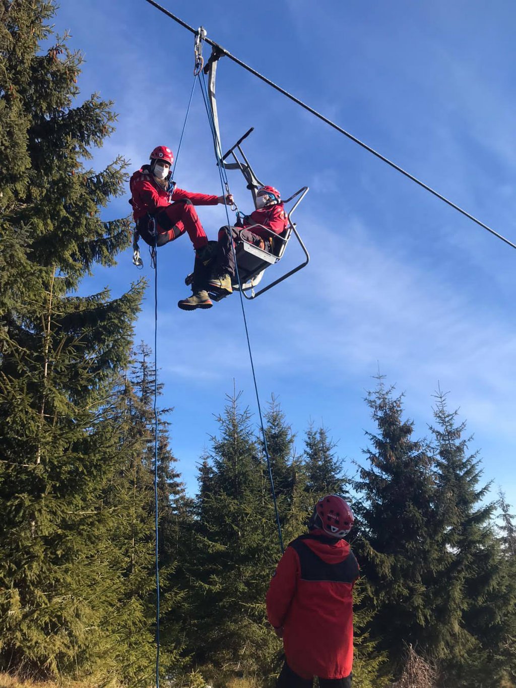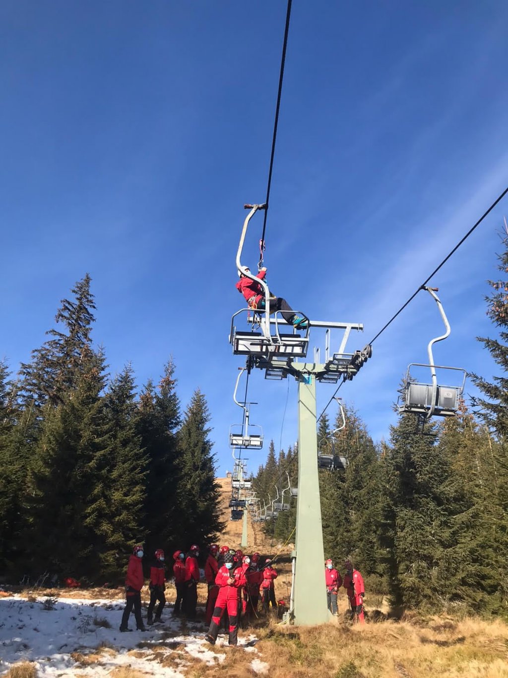 Salvamontiștii clujeni au organizat un exercițiu de salvare din telescaun, acțiune care face parte din pregătirea periodică a salvatorilor montani și care are loc în fiecare an înaintea deschiderii sezonului de schi.