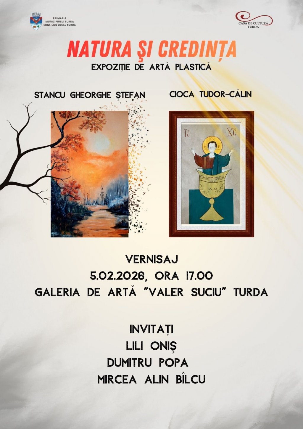“Vă invităm la vernisajul expoziției de pictură și grafică „Natura și Credința”, un dialog artistic între tradiție și expresia contemporană, unde natura, simbolul și credința se întâlnesc în compoziții expresive.