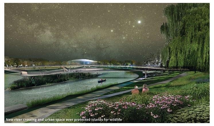 Recomandăm gândirea unui sistem de iluminat în ton cu restul proiectului, pentru ca râul să poată participa și la imaginea nocturnă a orașului. Invităm echipa de proiect să studieze malul stâng din proximitatea podului Horea și să detalieze o soluție noninvazivă, în acord cu ideea generală a proiectului. Recomandăm echipei să abordeze în aceeași manieră conexiunile cu Parcul Feroviarilor și cu zona Iris, posibile subiecte ale unor viitoare concursuri de soluții" - juriul concursului", puncta juriului concursului.