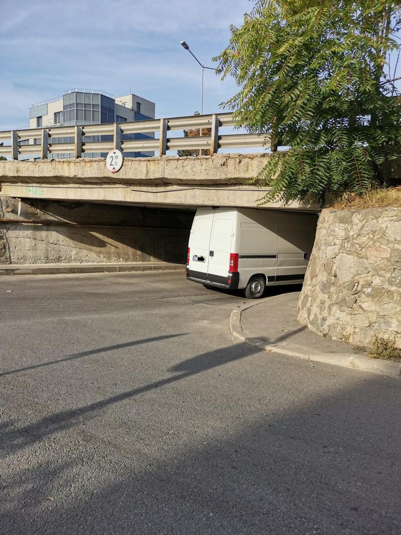 Tot blocat a rămas și șoferul unei dube care a intrat în pasajul de sub Calea Turzii, cu toate că la intrare există un indicator care îl avertiza că autoutilitara pe care o conduce nu va avea loc pe dedesubt.