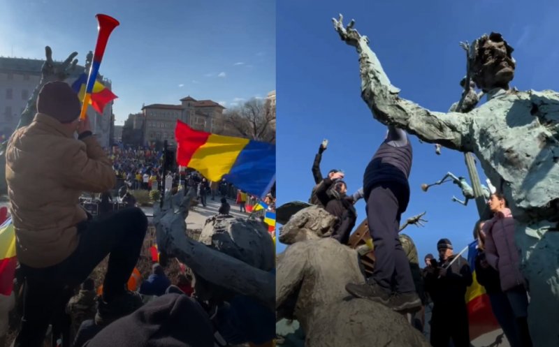 Mai mulți participanți la manifestația organizată de AUR în București, au stârnit revoltă în mediul online, după ce s-au urcat pe grupul statuar "Căruța cu paiațe", instalat în zona Teatrului Național din Capitală.
