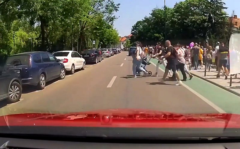 Un gest de inconştienţă din partea unei mame a fost surprins de camera de bord a unui participant la traficul din Cluj-Napoca joi, 1 iunie, lângă Parcul Central, unde au avut loc mai multe activităţi de Ziua Copilului.