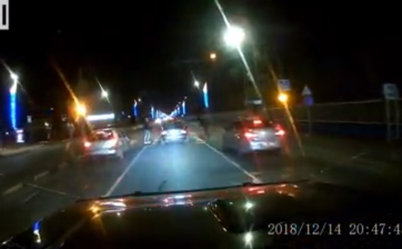 Imaginile, surprinse de camera de bord a unui alt conducător auto, arată cum șoferul vitezoman nu a încetinit când s-a apropiat de trecerea de pietoni și a trecut "la milimetru" printre cei doi oameni care traversau.