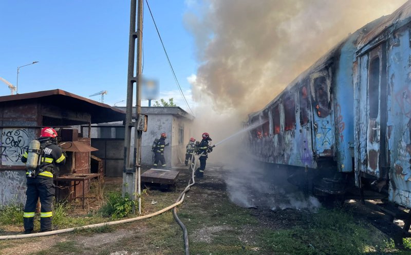 UPDATE 3: Pompierii au finalizat intervenția și din fericire nu au existat persoane rănite. Incendiul a pornit de la un vagon dezafectat, care completa o garnitură cu alte două vagoane. Flăcările s-au extins și la fațada unei clădiri, dar intervenția promptă a pompierilor a făcut ca incendiul să fie stins în limitele găsite. Astfel, clădirea a fost protejată, precum și celelalte două vagoane.