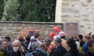 Credincioşii nu au respectat măsurile de protecţie sanitară nici la ieşirea din curtea mănăstirii a coloanei auto pentru procesiunea prin oraş, încercând să ajungă cât mai aproape de platforma pe care se aflau moaştele.