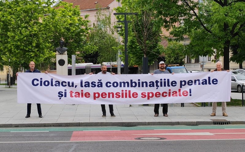 Manifestanții au afișat un banner pe care scria: „Ciolacu, lasă combinațiile penale și taie pensiile speciale!”.