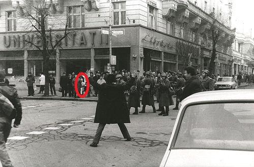 Instantaneele lui Răzvan Rotta, un alt martor al atrocităților din centrul Clujului, au făcut înconjurul Europei. Din zecile de fotografii, ochiul ager sesizează pe trotuarul de lângă Librăria Universității o mână de om. Poartă o jachetă albă și un fes pe cap. Nu! Din păcate, puștiul nu asistă la vreo piesă de teatru transpusă-n stradă. Soldații de jucărie au prins viață, au automatele îndreptate spre curajoșii ce-i sfidează în intersecție, dezvelindu-și piepturile. Când, dintr-o dată...