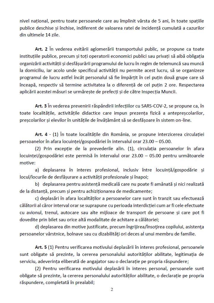 - Munca de acasă devine obligatorie: „Toate instituțiile publice, precum și toți operatorii economici publici sau privați să aibă obligația organizării activității și desfășurării programului de lucru în regim de telemuncă sau muncă la domiciliu, iar acolo unde specificul activității nu permite acest lucru, să se organizeze programul de lucru astfel încât personalul să fie împărțit în cel puțin două grupe care să înceapă, respectiv să termine activitatea la o diferență de cel puțin 2 ore”.