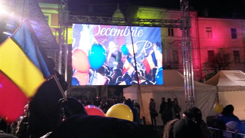 În piaţă erau câteva mii de clujeni, mulţi dintre ei purtând steguleţe şi baloane tricolore. Imediat după momentul festiv, pe scenă a urcat trupa Zdob şi Zdub, care a mai dezmorţit atmosfera, iar mulţi clujeni au început să danseze.