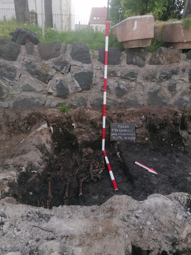 Două schelete umane au fost descoperite miercuri în zona săpăturilor care se execută în Piața Republicii din municipiul Turda, chiar în centrul oraşului.