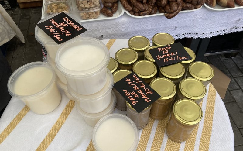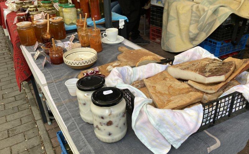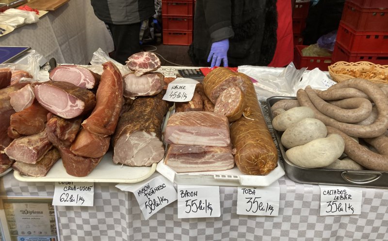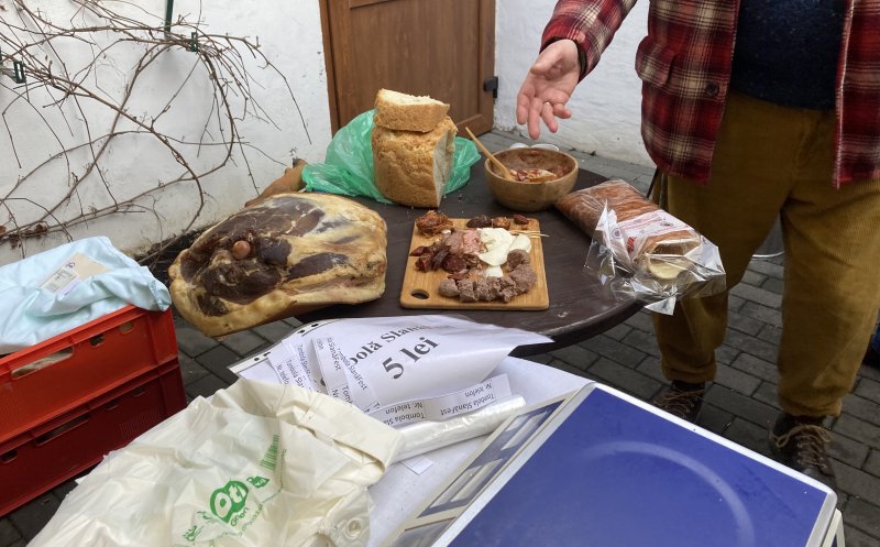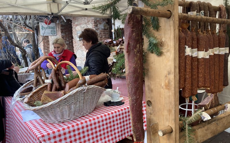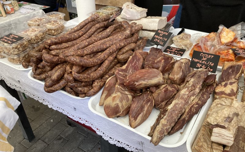 Vizitatorii târgului pot cumpăra produse din carne de porc, brânză, pâine de casă, zacuscă, murături, vin, țuică, prăjituri. Toate de la producători din țară.