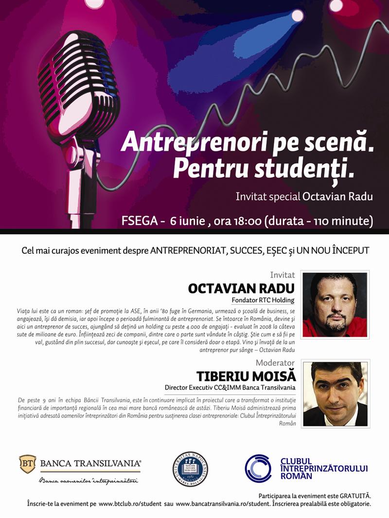 Moderatorul evenimentului "Antreprenori pe scenă. Pentru studenţi" va fi Tiberiu Moisă, director Executiv CC&IMM Banca Transilvania. Acţiunea este rezultatul parteneriatului dintre Banca Transilvania, Universitatea Babeş-Bolyai şi Clubul Întreprinzătorului Român