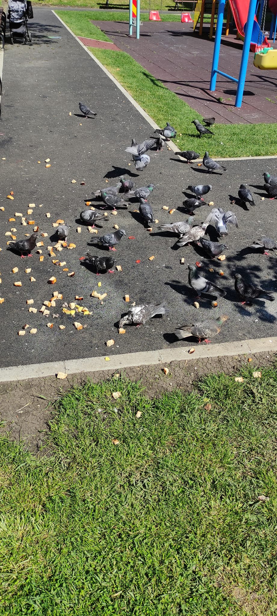 Porumbeii au umplut zona cu excremente după ce unele persoane şi-au făcut un obicei din a-i hrăni pe spaţiul public, mai exact în locurile de joacă, unde municipalitatea a montat covoare de cauciuc tartan.