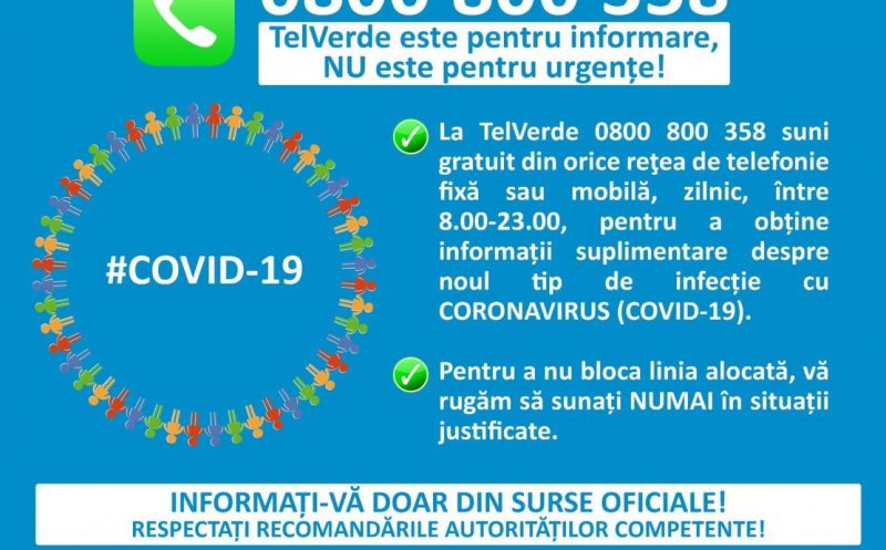 Linia telefonică TELVERDE este strict pentru informarea cetăţenilor şi nu este un număr de urgenţă! În cazul în care sunt suspiciuni asupra unor persoane care ar fi contractat virusul, aceste situaţii trebuie anunţate la numărul unic de urgenţă 112, precizează Grupulul de Comunicare Strategică.
