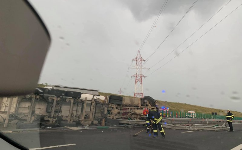 Foto Un camion plin cu nisip s-a răsturnat pe A10